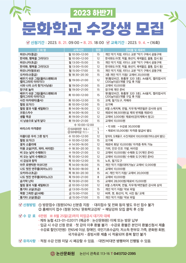수강신청은 논산문화원을 방문하거나 홈페이지를 통해 할 수 있으며 선착순으로 접수가 마감된다.