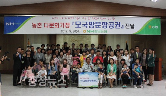 농협충남지역본부(본부장 임승한)는 오는 30일 지역본부 대회의실에서 어려운 가정 형편으로 친정을 방문하기 어려운 농촌 다문화가정 21가정(88명)에게 가족과 함께 친정을 방문 할 수 있는 왕복항공권과 체제비(50만원)을 전달하는 '모국방문 항공권 전달식'을 가졌다.