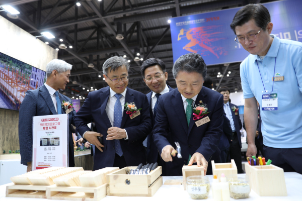 ‘2023 대한민국 목재산업박람회(WOOD FAIR 2023)’ 한국산림복지진흥원 홍보부스에서 남성현 산림청장(우측 두 번째)과 남태헌 한국산림복지진흥원장(우측 네 번째) 및 주요 내빈들이 국립청도숲체원 산림복지프로그램 ‘탄소중립 실천을 담은 연필꽂이 만들기’를 체험하고 있다.