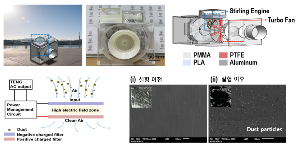 마찰대전 발전기에서 생산된 전기는 미세먼지 필터에 공급돼 기계·전기적 방식으로 미세먼지를 포집하고, 호퍼를 통해 재비산을 방지한다. 이 시스템은 실외에서 미세먼지를 효과적으로 제거하고, 에너지 자립성을 갖는다.