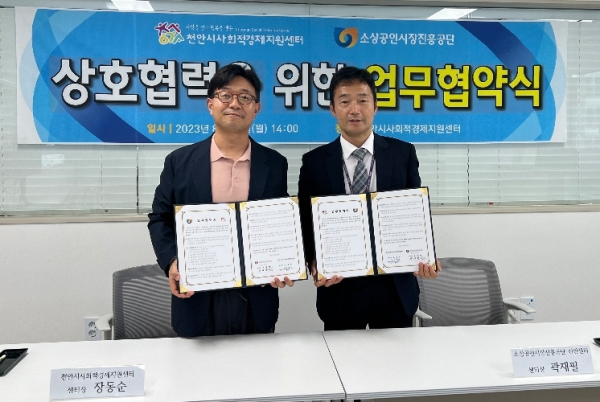 [충청뉴스 박동혁 기자] 소상공인시장진흥공단 대전충청지역본부 천안센터와 천안시사회적경제지원센터가 상호 협력을 위한 업무협약을 체결했다.