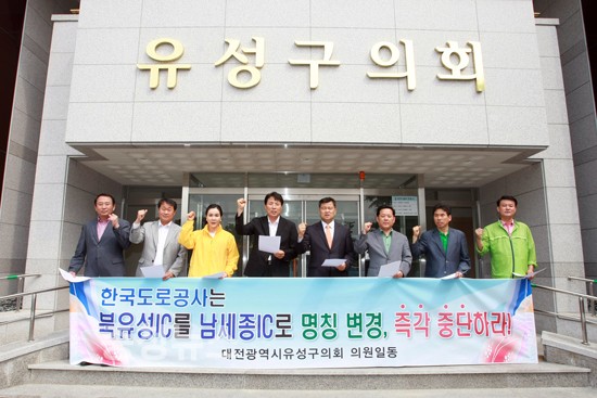 유성구의회(의장 윤종일)은 지난 5. 29일 한국도로공사의 북유성IC를 남세종IC로의 명칭 변경 확정에 대한 언론보도 내용에 대하여 30만 유성구민을 대표하는 유성구의회 의원 일동은 심각한 우려를 표명하며 명칭변경에 반대의사를 분명히 밝히고 즉각 철회하기를 강력히 촉구 했다.