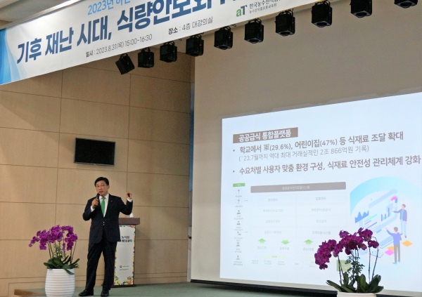 [충청뉴스 최형순 기자] 한국농수산식품유통공사 김춘진 사장은 31일 경기도 수원시 소재 농수산식품유통교육원에서 ‘기후재난 시대, 식량안보와 K-푸드의 미래’란 주제로 농식품 디지털 유통 전문경영인, 농식품 수출 마스터 전문가 과정 등 수강생 80여 명 대상 특별강연을 펼쳤다.