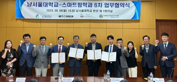 [충청뉴스 박동혁 기자] 남서울대학교는 스마트팜학과의 우수인력 양성과 상호 발전을 위해 주식회사 네토그린, ㈜스파라시스와 본관에서 업무협약을 체결했다고 6일 밝혔다.