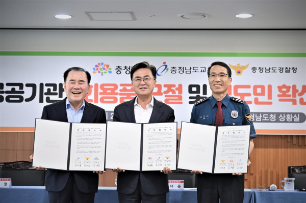 김태흠 지사는 이날 도청 상황실에서 김지철 도교육감, 유재성 도경찰청장과 공공기관 1회용품 근절 및 범도민 확산을 위한 업무협약을 체결했다.