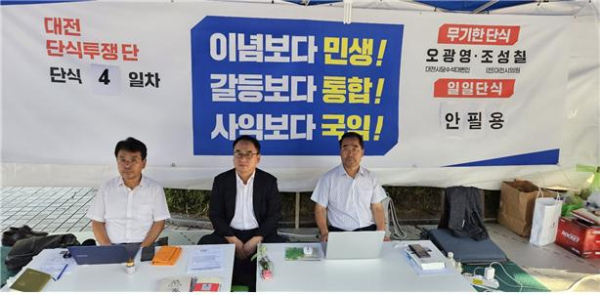 안필용(가운데) 전 대전시 비서실장이 8일 대전시청 앞에 설치된 천막에서 릴레이 단식에 돌입했다. (사진 = 안 전 실장 제공)