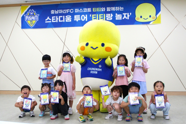 9일 충남아산FC에 따르면 ‘티티랑 놀자’는 구단 마스코트인 티티가 관내 어린이집·유치원 어린이들을 대상으로 스타디움 투어, 마스코트 스킨십 등의 프로그램을 진행하는 지역사회 공헌활동이다.
