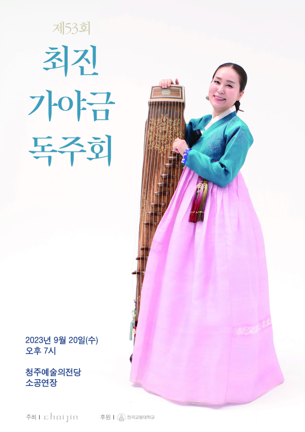 [충청뉴스 최형순 기자] 가야금 연주자 최진(한국교원대 음악교육과 교수)의 53번째 독주회가 오는 20일 수요일 오후 7시 청주예술의전당 소공연장에서 모두 초대로. 열린다.