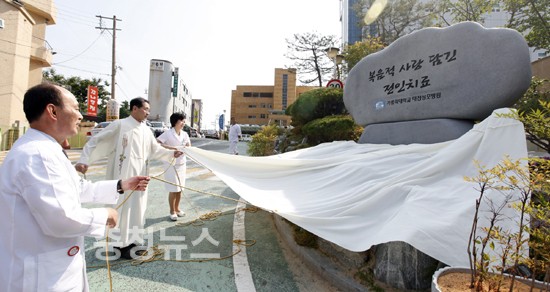가톨릭대학교 대전성모병원(병원장 박재만 신부)은 14일 오후 병원 상지관 지상주차장 앞에서 박재만 병원장 신부를 비롯해 병원 관계자들이 참석한 가운데 가톨릭중앙의료원 ‘올해의 이념 실천상’ 대상 수상을 축하하는 기념석 제막식을 가졌다.