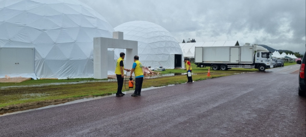 특히 위험도 평가에서 제기된 공주시 미르섬 주변 배수로의 물 고임 등에 따른 모기 유충 방제와 양 시군의 행사장 주변 진드기 등 해충 방제를 위해 하루 2회 이상 행사 전 사전 방역에 심혈을 기울이고 있다.