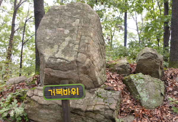 애기바위에서 화봉산성 방향으로 조금 더 걷다 보면 거북바위가 나타난다. 거북등처럼 갈라진 무늬가 있어서 거북바위라고 이름 지어진 듯하다.