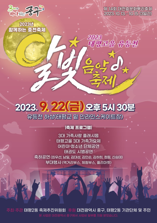[충청뉴스 충청뉴스] 대전중구청(청장 김광신)은 22일 중구 태평교 주변 유등천에서 이장우 대전시장과 주민 3,000명이 참여한 가운데 ‘2023 태평고을 유등천 달빛 음악 축제’를 개최했다.