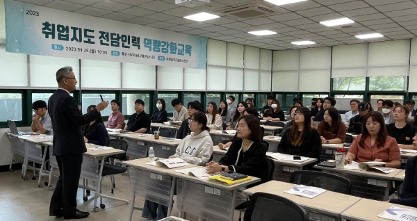 교육에서는 ‘2023 채용 트렌드 및 취업지도 역량 강화 방안’을 주제로 ▲대학 진로 교육의 현황과 추진 방향 ▲2023 채용 트렌드 ▲학과별 취업지도 역할 ▲취업 전담 교원과 담당 직원의 역할 및 방향성 제고 ▲비교과 프로그램 안내 등을 진행했다.