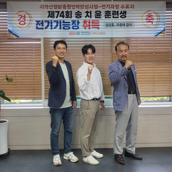 27일 대덕대에 따르면 제74회 전기기능장에 최종합격한 송치윤(31) 훈련생은 기룡전기(주) 공무팀 PM으로 재직하고 있는데, 대덕대 HRD 실무향상 교육을 통해 합격의 기쁨을 맛보았다.
