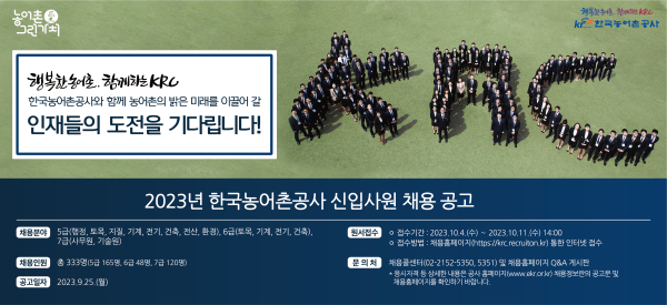 [충청뉴스 최형순 기자] 한국농어촌공사(사장 이병호)가 ‘2023년도 신입사원’ 333명을 공개 채용한다.