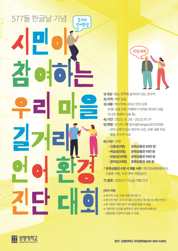 [충청뉴스 박동혁 기자] 상명대학교 국어문화원은 제577돌 한글날을 기념해 ‘시민이 참여하는 우리 마을 길거리 언어 환경 진단 대회’를 개최한다고 4일 밝혔다.