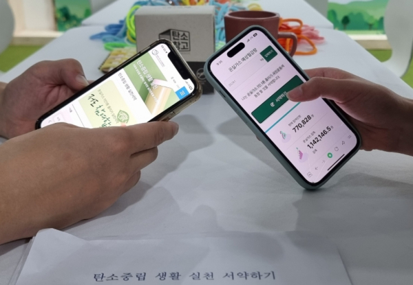 이번 프로그램은 ▲양말목을 이용한 업사이클 컵 받침 만들기 ▲재사용이 가능한 리유저블(reusable)컵활용 꽃차 체험 ▲「탄소중립 생활 실천 서약」(모바일) 순으로 진행됐으며, 참가자에게는 CXP*(Cellulose X-linked polymer) 목재로 만든 친환경컵을 제공했다.