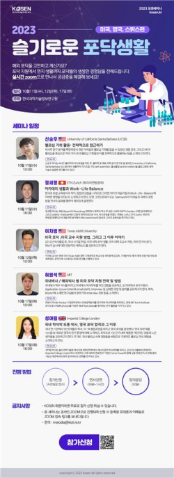 이번 세미나는 미국, 영국, 스위스 등 해외 박사후연구원(Post-Doc) 생활을 경험했던 5명의 한인 과학자들이 해외 포닥 지원과정부터 펠로십, 지원 전략, 합격 이후까지의 경험 등 다양한 포닥에 대한 정보와 노하우를 공유하기 위해 나선다.