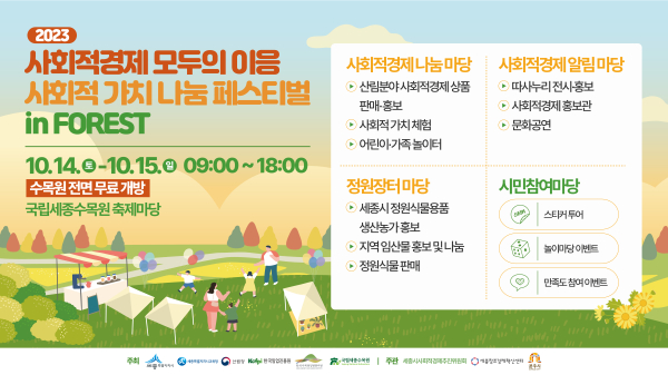 세종특별자치시(시장 최민호)는 오는 14일과 15일 양일간 국립세종수목원 축제 마당에서 ‘2023년 사회적경제 모두의 이응 사회적가치나눔페스티벌 인 포레스트(in Forest)’ 행사를 개최한다.