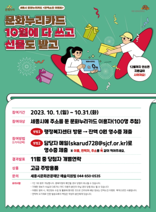 이번 이벤트는 문화누리카드 사용을 활성화하고, 기한 내에 사용이 이루어질 수 있도록 독려하기 위해 기획되었다. 10월 31일까지 문화누리카드를 사용하고, ‘잔액 0원’을 인증하면 추첨을 통해 100명에게 선물을 증정한다. 참여 방법은 사용한 영수증을 가까운 행정복지센터로 방문해 제출하거나 담당자에게 이메일(skarud728@sjcf.or.kr)로 제출하면 된다.