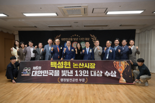 [충청뉴스 논산 = 조홍기 기자] 백성현 논산시장이 지난 10일 서울 영등포 이룸센터에서 열린 ‘대한민국을 빛낸 13인 대상’ 시상식에서 행정발전 부문 대상을 수상했다.