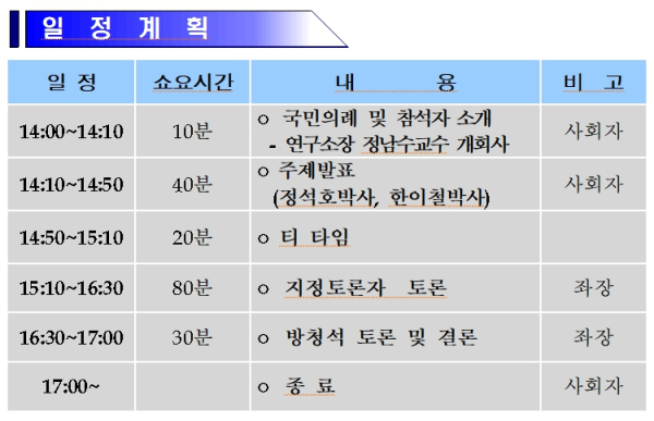 주제발표는 정석호 충남마을만들기 센터장과 한이철 농촌경제연구원 공간계획 부연구위원이 ‘주민주도형 사업계획과 사후관리’와 ‘농촌계획의 한계와 농촌 공간 정비계획’에 관한 주제로 발표할 예정이다.