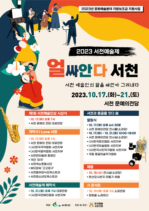 서천예총은 매년 서천군의 전문예술단체와 생활문화동아리의 공연과 전시를 통하여 예술가들의 경계를 허물고 하나의 군민 하나의 예술가가 될 수 있도록 노력하고 있으며, 특히 제14회 서천예술제는 ‘얼싸안다 서천’이라는 주제를 가지고 서천의 예술가들의 얼을 표현하고 예술문화단체를 함께 안고 갈 수 있는 시간이 될 수 있도록 기획되었다.