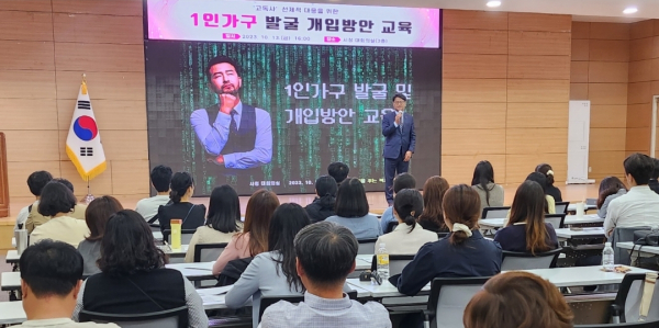 이날 부산 괘법동 행정복지센터에서 복지 업무를 담당하고 있는 이지연 주무관이 강사로 나서 1인 가구 위험군 발굴과 대응 방안에 대한 강의를 진행했다.