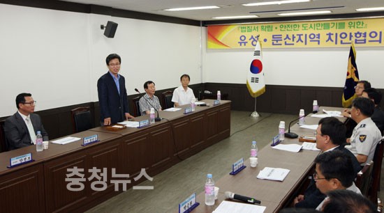 법질서 확립과 주민의 생활안전 향상을 위한 유성·둔산지역 치안협의회가 허태정 유성구청장, 이병환 둔산경찰서장 등 치안협의회 위원 9명 등 관계자가 참석한 가운데 27일 오전 11시 둔산경찰서 소회의실에서 열려 기관간 협조사항과 상호 협력방안 등을 논의했다.
