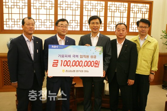 농협충남지역본부(본부장 임승한)는 금융산업노동조합 농협중앙회지부 충남지역본부(본부장 류병관)와 함께 27일 충남도청을 방문하여 안희정 충남도지사에게 노·사가 한마음으로 뜻을 모아 십시일반 모금한 '가뭄피해 극복 성금' 1억원을 전달했다.