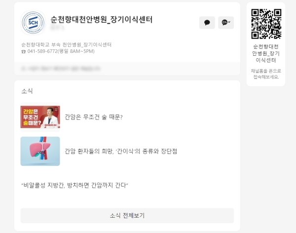 [충청뉴스 박동혁 기자] 순천향대학교 부속 천안병원은 장기이식센터(센터장 배상호)가 카카오톡 채널을 개설했다고 17일 밝혔다.