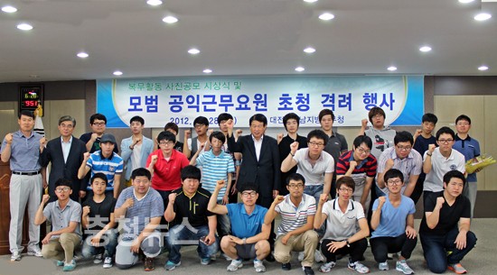 이 자리에는 사회복지시설, 국공립병원, 도시철도공사 등 비선호 기관에서 복무중인 공익근무요원과 선행활동으로 복무기관에서 추천한 모범공익요원이 참석하였다. 또한 지난 5월 ‘복무활동 사진공모전’에서 최우수상을 받은 청양군 장애인심부름센터의 정문영 군 등 6명도 자리하여 지방병무청장 상장과 부상을 받았다.