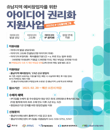 박태진 충남지식재산센터장은 “예비창업자들을 위한 맞춤형 프로그램을 통해 애로사항을 해결하고, 창업·사업 수행에 큰 도움이 될 것”이라며 “우수창업자와 우수기업에 대해 후속 연계도 이뤄질 수 있도록 지속적으로 노력하겠다”고 말했다.