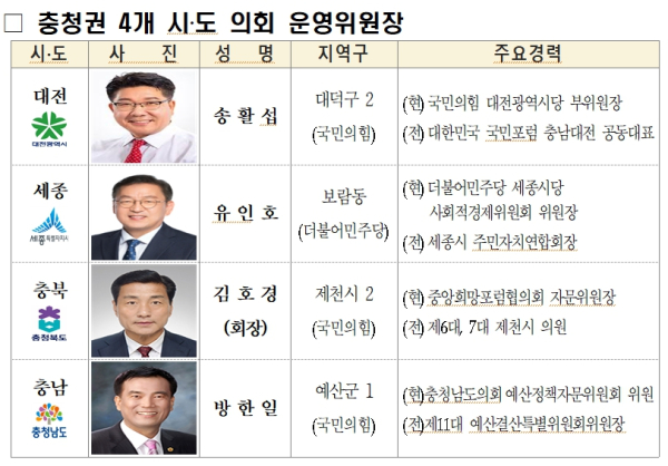 충청권 의회 협의체는 초광역의회 구성 논의를 위해 지난 6월에 4개 시·도의회 운영위원장과 사무처장을 중심으로 구성돼 규약 협의와 시·도 의회 간 연계·협력 방안 등을 논의해 왔다.