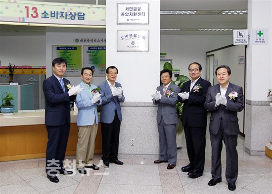 정하윤 시 경제산업국장을 비롯해 고찬태 금융감독원대전지원장, 김윤식 대전신용보증재단이사장, 신충태 한국자산관리공사대전충남지역본부장, 유재욱 미소금융지점재단지원부장, 곽근수 신용회복위원회대전지부장 등이 참석한 가운데 29일 오전 시청 2층 종합민원실에서 ‘서민금융종합지원센터’ 개소식을 가졌다.