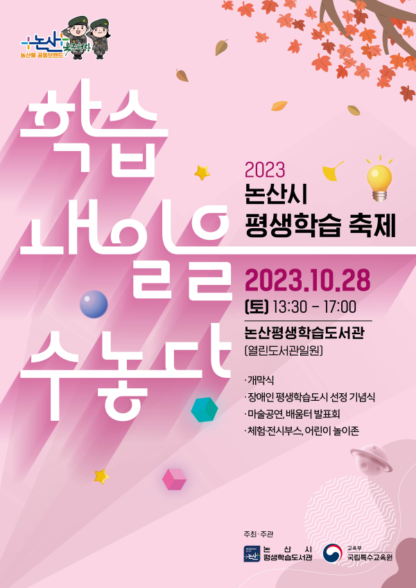 시는 오는 28일 10시에 논산열린도서관(관촉로 113-23) 일원에서 『2023 논산시 평생학습축제』의 막을 연다고 밝혔다. 아울러 올해 축제는 논산시가 지난 3월 교육부(국립특수교육원)로부터 ‘장애인 평생학습도시’로 지정됨에 따라 장애인 평생학습 축제 성격도 함께 띠게 되어 의미가 깊다고 전했다.