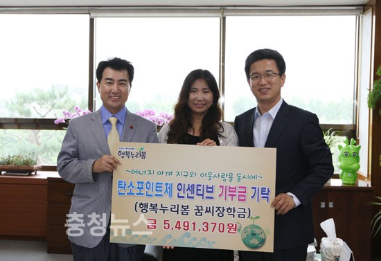 대전광역시 유성구(구청장 허태정)가 4일 오전 구청 행복사랑방에서 탄소포인트 인센티브 549만원을 대전사회복지공동모금회에 저소득층 가정 학생 장학금으로 지정 기탁했다.