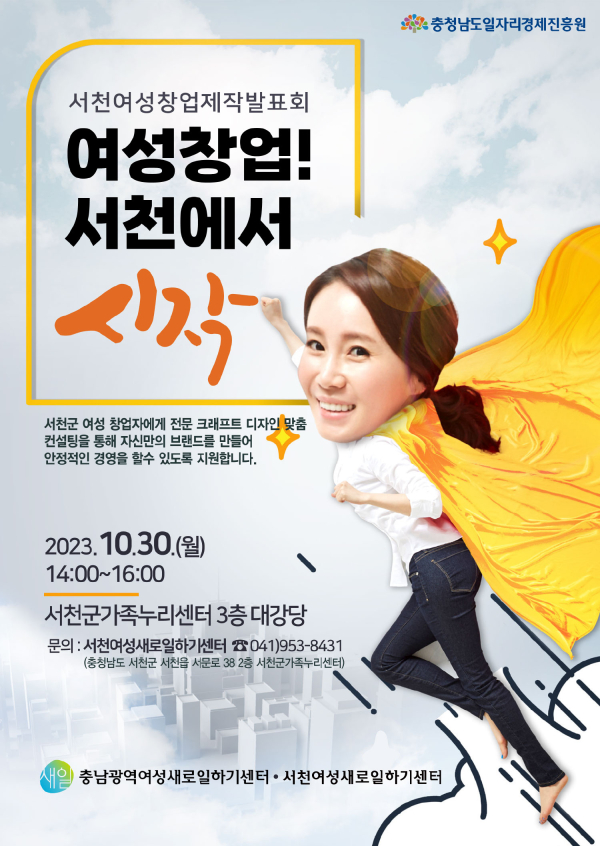 충남광역새일센터와 서천여성새일센터가 주관하는 이번 행사에는 경력단절여성 및 예비 창업자를 대상으로 ▲창업 제작발표회 ▲창업 토크 콘서트 ▲제작물 전시회가 진행된다.