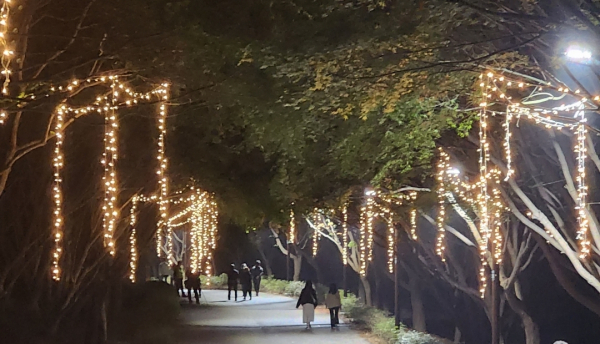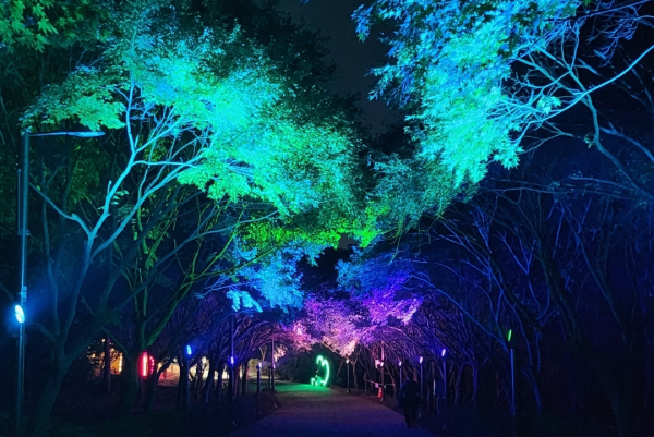 [충청뉴스 박동혁 기자] 독립기념관 단풍나무숲길이 가을밤 화려한 조명으로 옷을 갈아입었다.