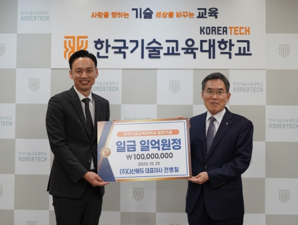 [충청뉴스 박동혁 기자] 한국기술교육대학교(이하 한기대)는 졸업 동문 전병칠 ㈜다산에듀 대표가 대학발전기금 1억 원을 쾌척했다고 28일 밝혔다.