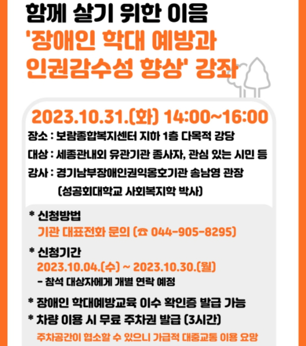 [충청뉴스 최형순 기자] 세종특별자치시(시장 최민호)가 세종시장애인권익옹호기관(관장 권재환)과 공동으로 오는 31일 보람종합복지센터 다목적강당에서 ‘장애인 학대 예방과 인권 감수성 향상’을 위한 시민강좌를 개최한다.
