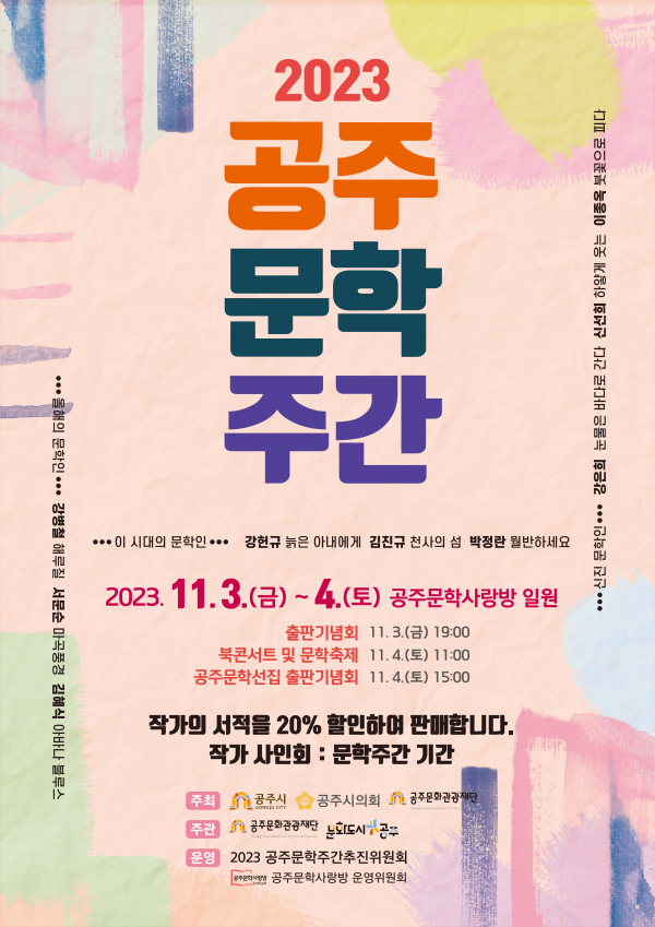 첫째 날 진행하는 출판기념회는 ‘2023 공주 문학인 출판사업’에 선정된 공주지역 문학인이다. 올해 사업을 통해 재단에서는 공주시 문학계의 원로 및 중견, 신진 부문의 작가를 각 3명씩 총 9명의 작가의 책 출판과 함께 출간에 따른 대내·외 홍보를 지원하고 있다.