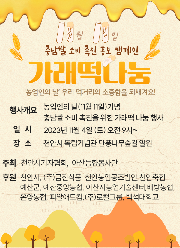 독립기념관 단풍나무숲길을 찾은 관광객과 시민을 대상으로 3,000명분의 가래떡과 홍보용 쌀 등을 나눠주며 우리 농산물 애용 캠페인을 펼칠 예정이다.