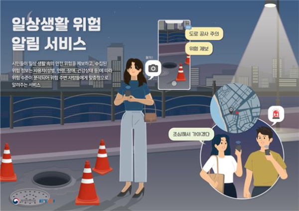 특히 본 서비스는 사용자 맞춤형으로 이용자의 위치, 나이, 장애 여부 등 개인별 안전 취약도에 따라 맞춰 일상 속 각종 안전 위험을 미리 알림으로 제공한다.