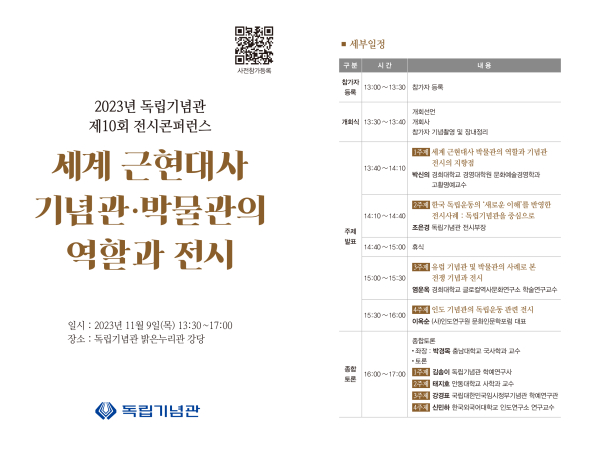 [충청뉴스 박동혁 기자] 독립기념관은 한국 독립운동의 세계사적 가치 확산과 기념관 전시 세계화 방안 모색을 위해 ‘2023년 제10회 전시콘퍼런스’를 오는 9일 독립기념관 밝은누리관 강당에서 개최한다고 밝혔다.