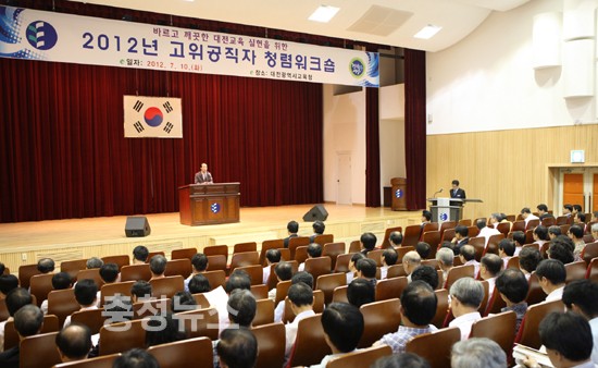대전시교육청(교육감 김신호)은 10일 오후 2시부터 대전시교육청 대강당에서 관내 학교장과 본청·직속기관·교육지원청의 과장(급) 이상 간부공무원을 대상으로 바르고 깨끗한 대전교육 실현을 위한 '2012년 고위공직자 청렴워크숍'을 실시했다.