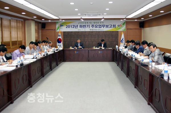 부여군(군수 이용우)은 지난 11일 오전 군청회의실에서 이용우 군수를 비롯한 실과단소·읍면장 등 40여명이 참석한 가운데 2012년도 하반기 주요업무 추진계획 보고회를 개최했다.