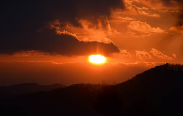 우리 일행이 이곳에 도착한 시간은 오후 5시 경이라 일몰이 시작하는 시간대이다. 하늘이 붉은 노을로 물들고 있다. 태양이 구름 속에서 나오는 붉은 노을을 보면서 연신 감탄한다.