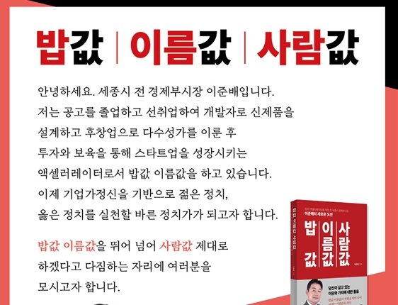 한편, 이준배 전 부시장은 오는 25일 세종시 조치원 복합커뮤니티센터 대공연장에서 ‘밥값, 이름값, 사람값’의 출판기념회를 진행할 예정이다.