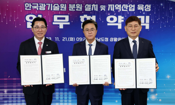도는 21일 도청 상황실에서 김태흠 지사와 박경귀 아산시장, 신용진 한국광기술원장이 세계 디스플레이 시장을 주도해 나갈 차세대 디스플레이 분야 연구개발 및 관련 사업의 육성‧발전 등을 위해 ‘한국광기술원(KOPTI) 충남 분원 설치 및 지역산업 육성을 위한 협약’을 체결했다고 밝혔다.